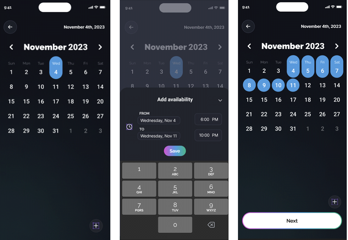 This was a new feature I created in order to appeal to users who would rather manually add in the dates they were available on. To use this feature, users tap on the “+” button on the bottom right of the calendar screen and then manually type in their availability for specific dates.