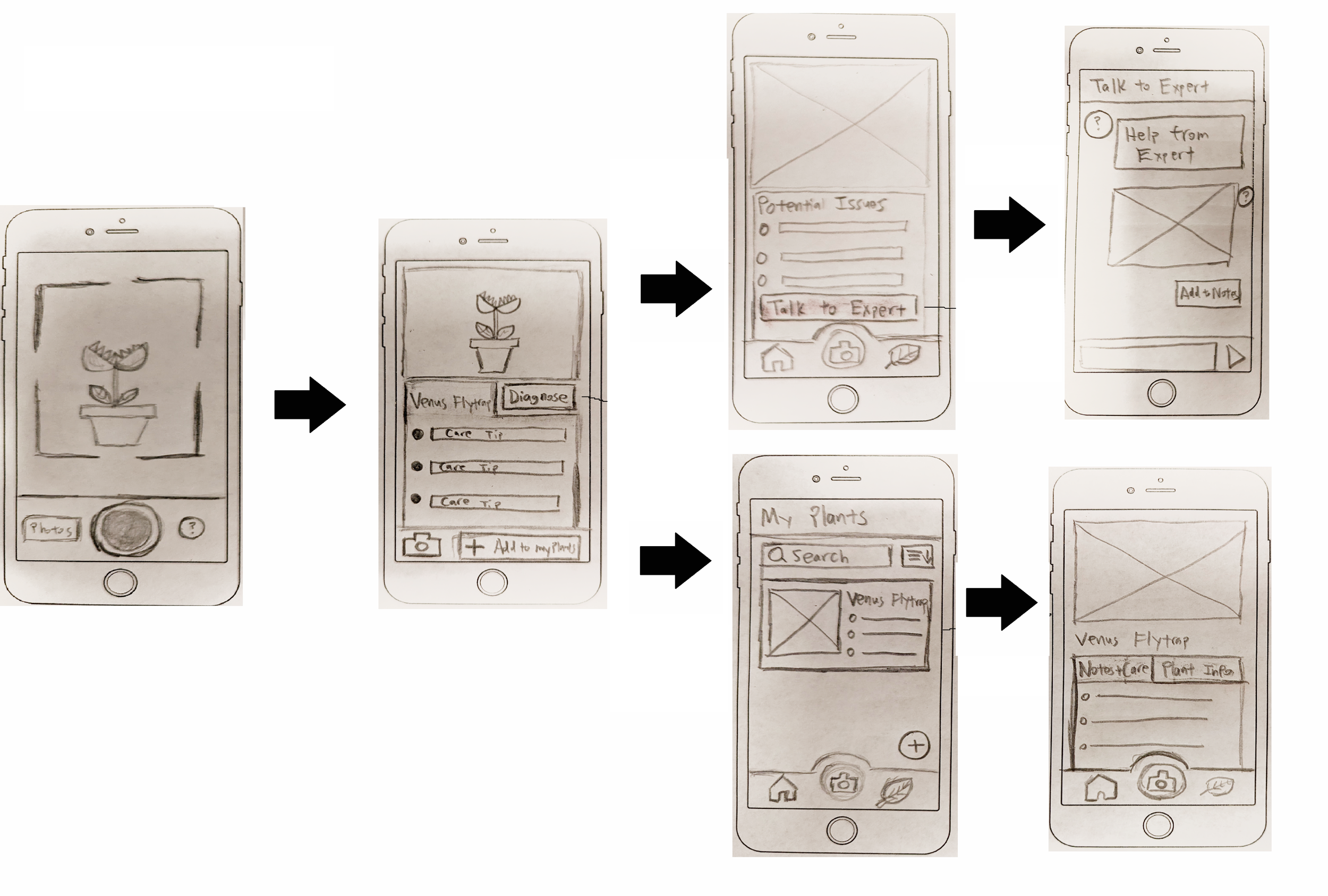 With my research and two personas in mind, I started to create my sketches. Originally, I designed the app around two key features in order to appeal to both the Beginner and Green Thumb personas.