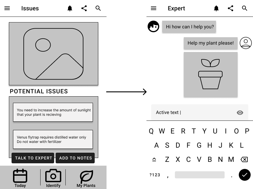 This also flowed neatly into two separate functions. The user could directly ask for help on their plant by clicking on the Diagnose button, which would lead to the previously mentioned Talk to Expert feature, or they could add the plant they just took a picture of to their Plant Profile for later use.