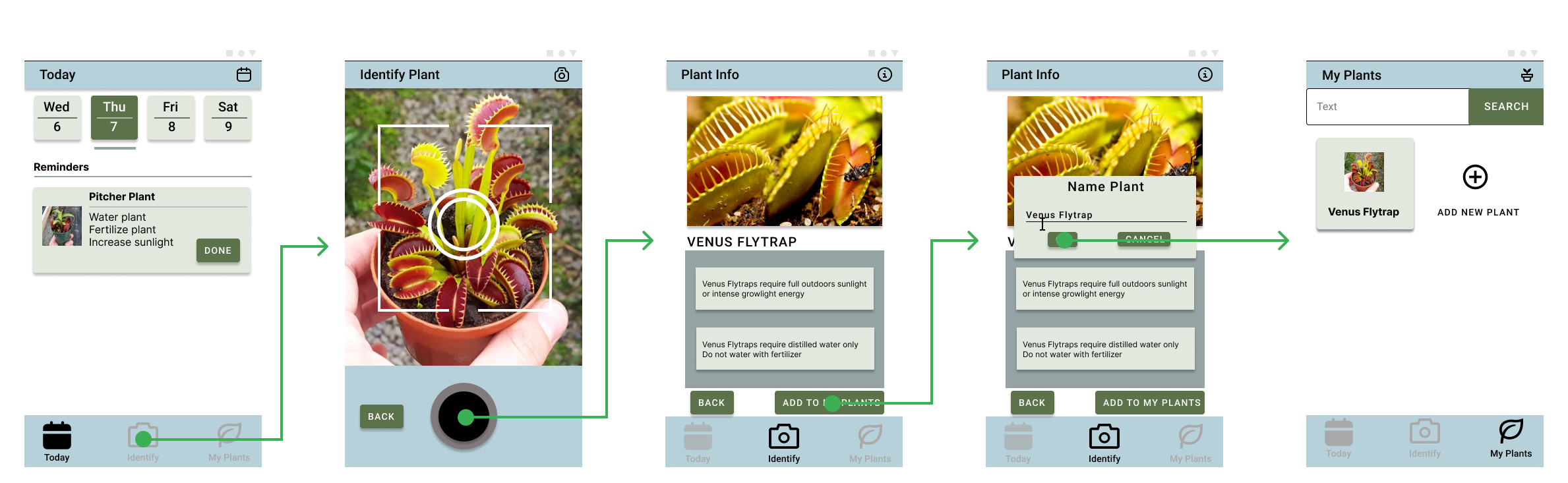 Users would click on the Identify button to open up their device’s camera, where they would then point at their carnivorous plant and take a picture. The app would then directly identify the plant, and provide care instructions. Users could then click on the Diagnose button to see what’s wrong with their plant, or add the plant to their Plant Profiles.